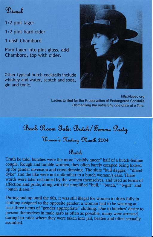 thematic cocktails and optional butch/femme attire. All sorts of guys and gals